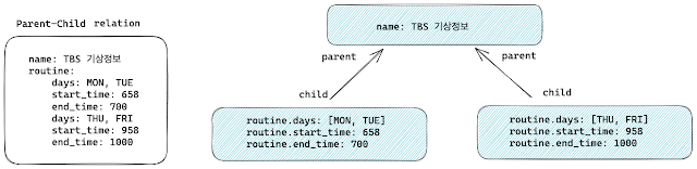 { "program_name": "TBS 기상정보", "channel_name": "TBS FM", .... "routine": [ { "days": [ "MON", "TUE" ], "start_time": 658, "end_time": 700 }, { "days": [ "MON", "TUE" ], "start_time": 958, "end_time": 1000 } ] }User Query