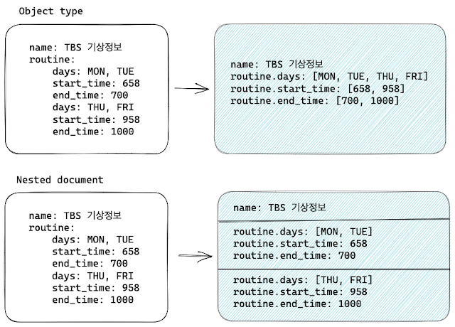 - '월요일 6시 59분 라디오'의 결과도 찾을 수 있고, 월요일 9시 59분 라디오를 검색했을 때 '결과 없음'이 정상이지만 Object type에서는 잘못된 결과를 주었고, Nested document에서는 결과 없음을 줄 수 있다.