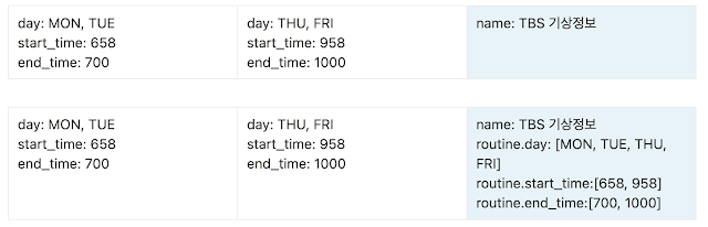 { "routine": [ { "days": ["MON"], "start_time": 1500, "end_time": 1600 } ] }- 아래처럼 데이터를 비정규화(Denormalize) 하여 평평한 데이터(Flattened data)를 만든다.