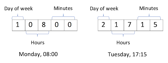 denormalize - 위 그림처럼 월~일요일을 1~7으로 치환하여 시간 앞에 붙여서 숫자로 만든다.