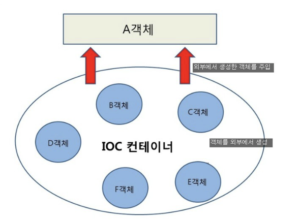 IoC container - 가져온 그림에서 약간 잘못된 부분이 있는데 A객체가 IoC컨테이너에 생성된 객체(bean)를 주입받기 위해서는 A객체도 bean으로 등록되어있어야 한다.