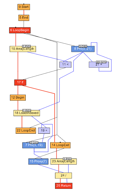program -> data sturcture int average(int[] values) { int sum = 0; for (int n = 0; n < values.length; n++) { sum += values[n]; } return sum / values.length; }- 기존 C2도 유사한 데이터 구조를 사용했기 때문에 Graal이 혁신이라고 할 수 없지만 데이터 구조를 최적화하고 컴파일할 때 JAVA의 이점은 그래프 구조가 객체지향 언어와 완벽하게 호환되기 때문