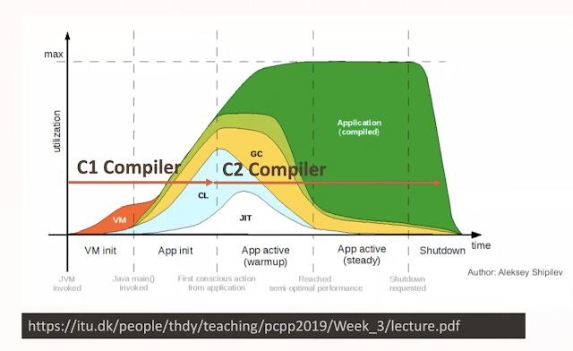 c1, c2 compiler - JVM에서 처음 호출되자마자 컴파일되는 것은 아니고, 메서드 호출마다 횟수를 기록, 특정 수치를 초과하면 컴파일(warm up → C1, C2 컴파일 이후)