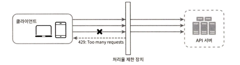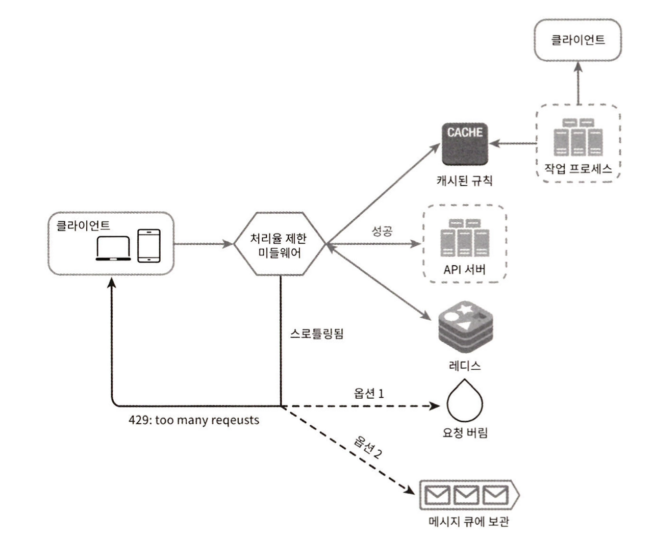 클라이언트가 요청을 서버에 보내면 요청은 먼저 처리율 제한 미들웨어에 도달