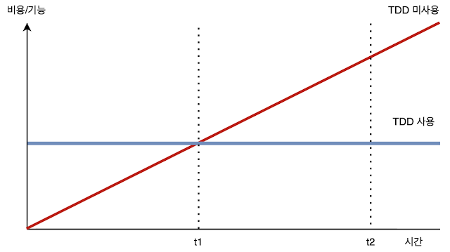 TDD, 비용, 시간 위 그림을 보았을 때 TDD를 통한 효과를 얻기까지는 꽤 오랜 시간(t2)이 걸릴 수 있기 때문에 적용여부에 대해서는 많은 고민이 필요해 보입니다. 운영하는 서비스의 운영기간이 t2보다 짧다면 효과를 볼 수 없기 때문입니다. 운영기간이 단 하루인 코딩테스트의 경우에 TDD를 적용하는 것은 별로 의미가 없어 보입니다. 다만 위 문제와 같이 지속적인 리펙토링이 필요한 테스트의 경우 TDD에 익숙하다면 시도해 볼 수도 있지 않을까? 싶네요.😅