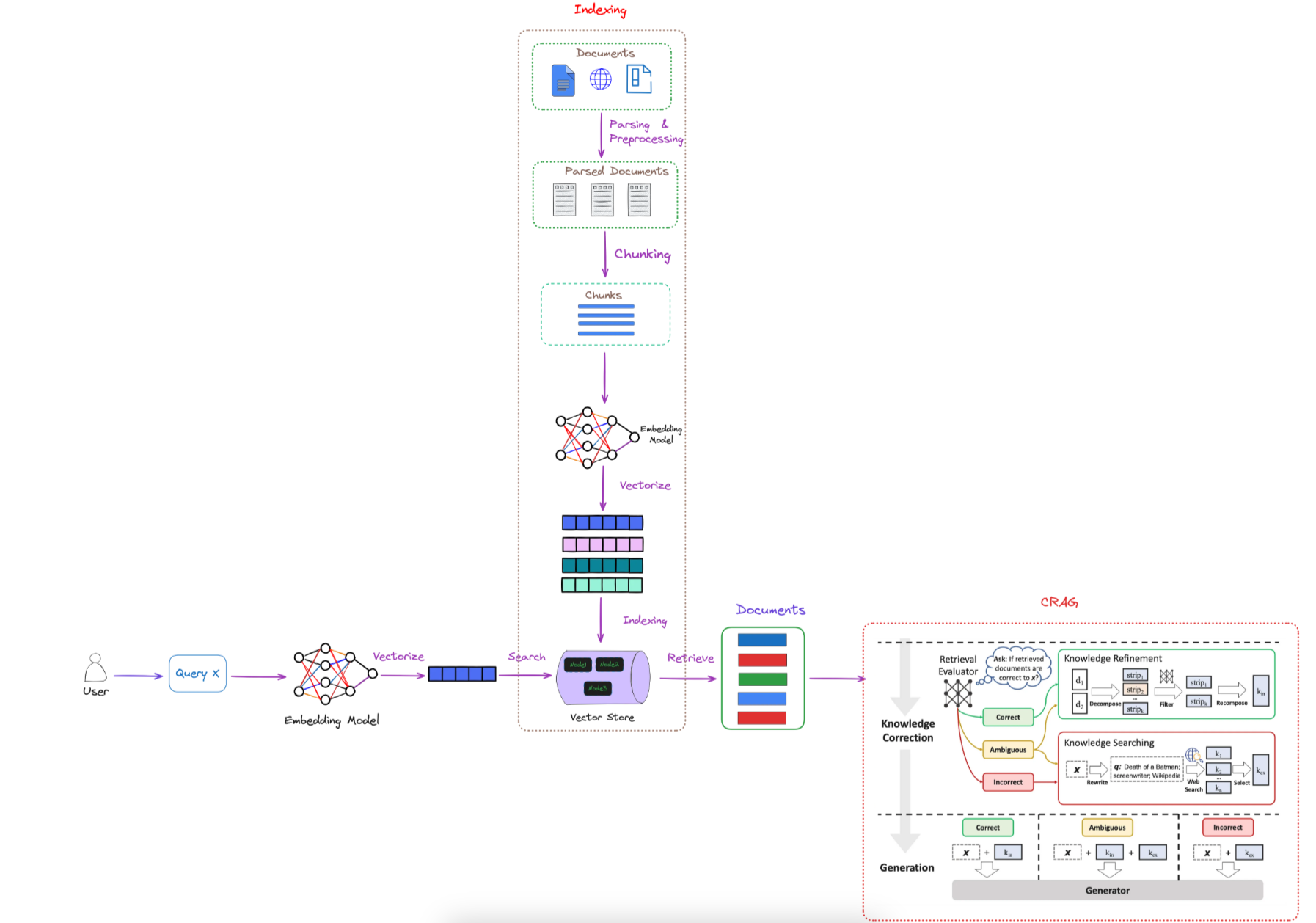 - 가벼운 검색 평가기를 사용하여 쿼리에 대해 검색된 문서의 전반적인 품질을 평가하고 각각에 대한 신뢰도 점수를 반환