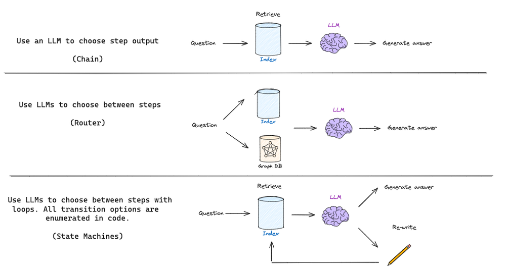 - 질문을 다시 생성하거나 문서를 다시 검색하는 일종의 피드백을 상태머신을 사용(검색, 문서 채점, 쿼리 재작성)